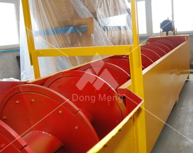 该洗砂机是借助于固体粒大小不同,比重不同,因而在液体中的沉降速度不同的原理,细矿粒浮游在水中成溢流出,粗矿粒沉于槽底。由螺旋推向上部排出,工作时,电机通过三角带、减速机、齿轮减速后带动螺旋缓慢转动,砂石有给料槽进入洗槽中,在螺旋的带动下翻滚,并互相研磨,除去覆盖砂石表面的杂质,同时破坏包覆砂粒的水汽层,以利于脱水;同时加水,形成强大水流,及时将杂质及比重小的异物带走,并由螺旋推向上部排出,完成清洗作用。